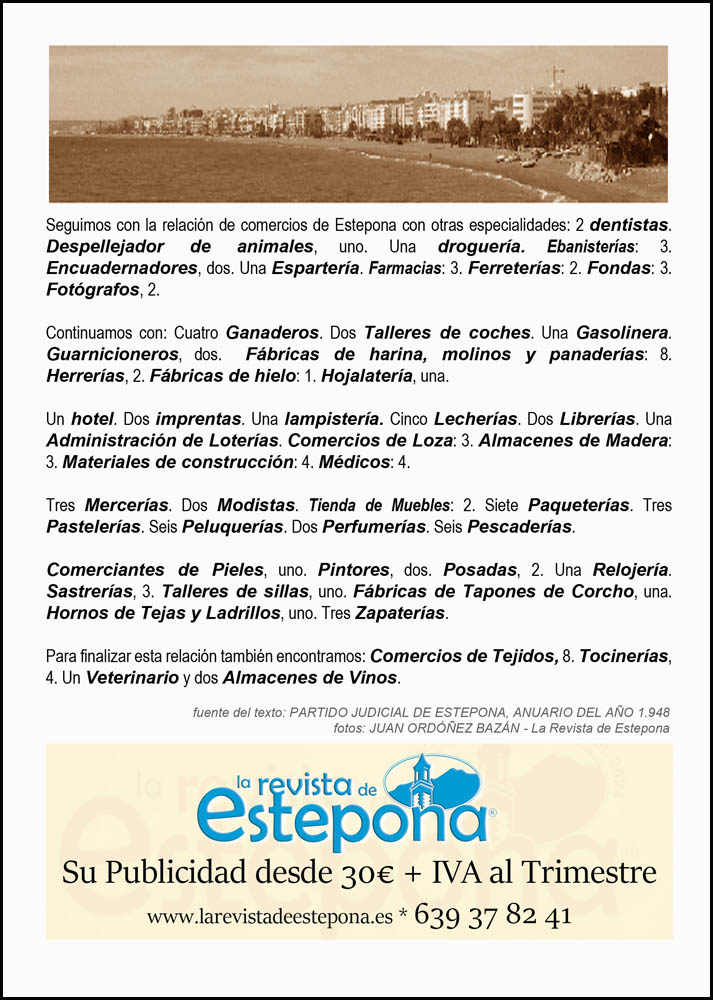 Tomando como referencia EL ANUARIO DEL AÑO 1.948 del PARTIDO JUDICIAL DE ESTEPONA, encontramos los siguientes sectores de los comercios y negocios locales: Despachos de Abogados, nos encontramos con 4. Venta de Abonos, uno. Academias, una. Además de una Administración de fincas.